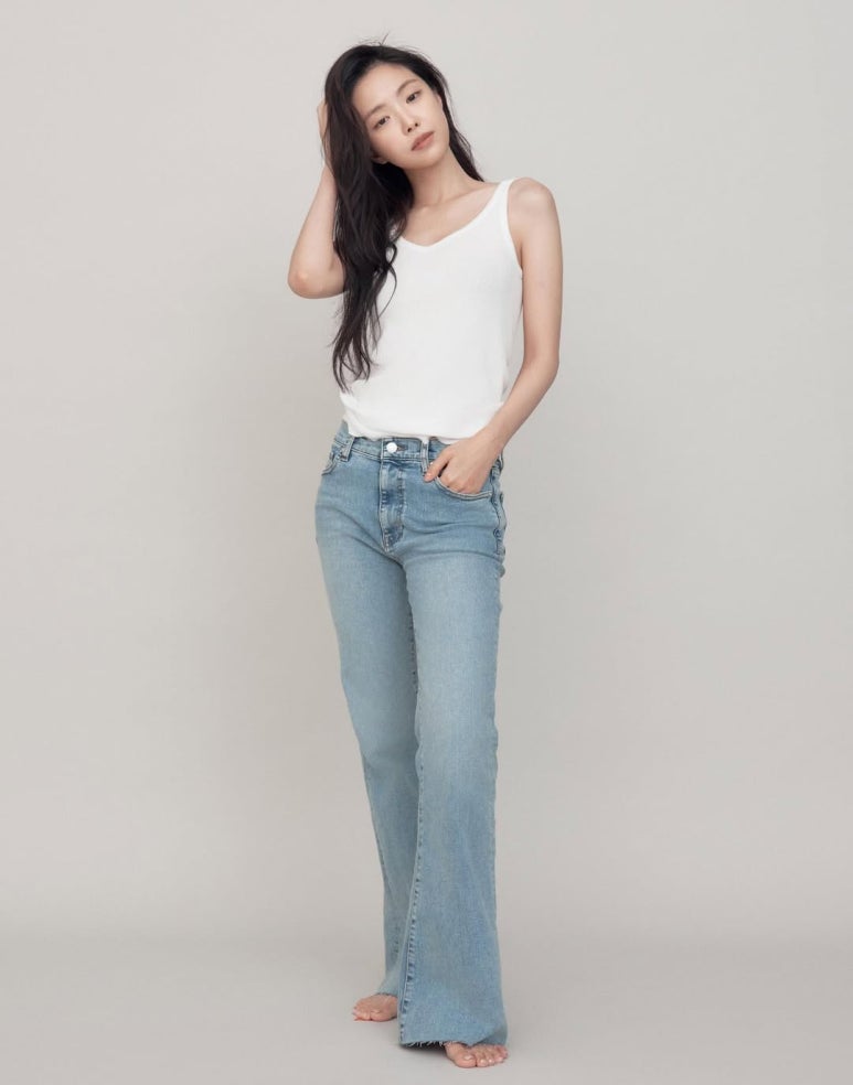 - 하의: 상의와 비슷한 톤의 데님 팬츠를 착용했습니다. 군더더기 없는 깔끔한 디자인의 청바지는 그녀의 완벽한 다리 라인을 돋보이게 합니다.