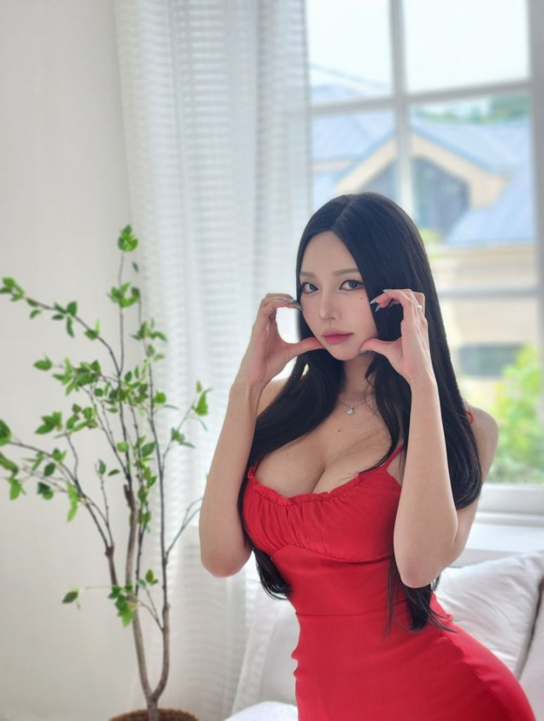 푸릇한 창밖을 배경으로, 동그란 님의 고혹적인 분위기가 돋보이는 사진입니다. 몸매를 강조하는 레드 원피스와 긴 생머리가 어우러져 섹시하면서도 우아한 매력을 동시에 보여줍니다.
